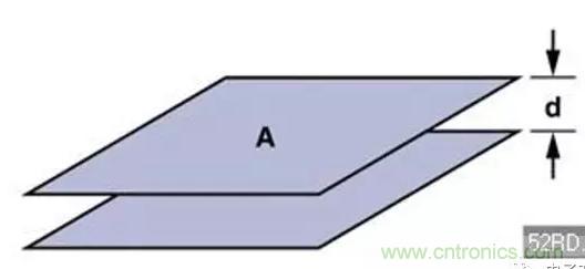 當尋找有問題的寄生源時,可能用得著幾個計算上述那些寄生電容尺寸的基本公式。(公式一)是計算平行極板電容器的公式,如(圖五)。