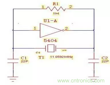 Y1是晶體,相當(dāng)于三點式里面的電感,C1和C2就是電容,5404非門和R1實現(xiàn)一個NPN的三極管,接下來分析一下這個電路。