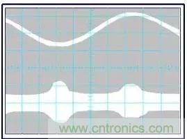 測量共模線圈磁芯(整體或部分)的飽和特性通常是很困難的。通過簡單的試驗可以看出共模濾波器的衰減在多大程度上受由60Hz編置電流引起的電感減小量的影響。進行此項測試需要一臺示波器和一個差模抑制網絡(DMRN)。首先,用示波器來監測線電壓。按如下方法從示波器的A通道輸入信號,將示波器的時間基準置為2ms/div,然后將觸發信號加在A通道上,在交流電壓達到峰值時會有線電流產生,此時濾波器效能的降級是意料中的事情。差模抑制網絡(DMRN)的輸入端連接到LISN,輸出端用50的阻抗進行匹配且與示波器的B通道相連。當共模扼流圈工作在線性區時,在輸入電流波動期間,B通道監測到的發射增加值不超過6—10DB。圖1為此測試在示波器上顯示的結果,上面的曲線為共模發射;下面的曲線為線電壓。在線電壓峰值期間,橋式整流器正向導通且傳送充電電流。