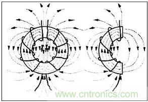 磁芯的作用就好象它在線圈繞組的間隙處裂為兩半時所表現出來的效果一樣。每個繞組在環形線圈一半的區域內產生磁場,意指穿過空氣的磁場必定會形成自封閉回路,下圖是環形磁芯和差模電流磁路的示意圖。