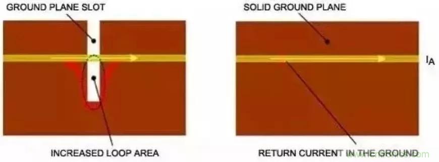 返回電流通路須盡可能靠近主電流通道,將輻射磁場降至最小。這種布局有助于減小電流環路面積。返回電流的理想低阻通路通常是引線下方的接地區域—將環路面積有效限制在電介質厚度乘以引線長度的區域。但是,如果接地區域被分割開,則會增大環路面積(圖3)。對于穿過分割區域的引線,返回電流將被強制通過高阻通路,大大提高了電流環路面積。這種布局還使電路引線更容易受互感的影響。