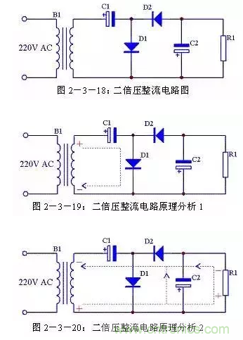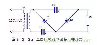 二倍壓整流電路還有另外一種形式的畫法,見圖2-3-21,其原理與圖2-3-18完全一致,只是表現形式不一樣。