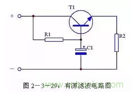 當對濾波效果要求較高時,可以通過增加濾波電容的容量來提高濾波效果。但是受電容體積限制,又不可能無限制增大濾波電容的容量,這時可以使用有源濾波電路。其電路形式見圖2-3-29,其中電阻R1是三極管T1的基極偏流電阻,電容C1是三極管T1的基極濾波電容,電阻R2是負載。這個電路實際上是通過三極管T1的放大作用,將C1的容量放大β倍,即相當于接入一個(β+1)C1的電容進行濾波。