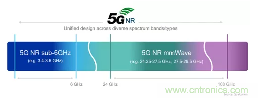 5G通信采用的頻段規范稱作“5G新空口”(5G New Radio,5G NR),使用6 GHz以下頻率以及毫米波波段,見圖5。數據率為10~20Gbps