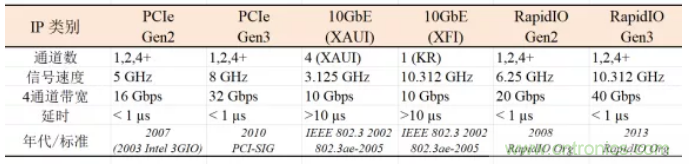 高速IP接口吉比特以太網10GbE (IEEE 820.3ae-2002)采用全工協議(full-duplex protocol),用來處理以太網的高數據率數據,廣泛用于需要高帶寬的企業服務器和數據中心等, 表1列出了10GbE (連接MAC層和PHY層的)的兩種接口參數,即4通道XAUI模式和單通道XFI/KR模式。