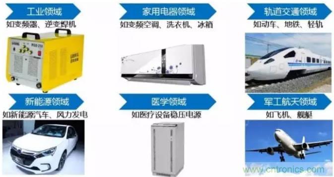 作為新型功率半導(dǎo)體器件的主流器件,IGBT已廣泛應(yīng)用于工業(yè)、 4C(通信、計(jì)算機(jī)、消費(fèi)電子、汽車電子)、航空航天、國(guó)防軍工等傳統(tǒng)產(chǎn)業(yè)領(lǐng)域,以及軌道交通、新能源、智能電網(wǎng)、新能源汽車等戰(zhàn)略性新興產(chǎn)業(yè)領(lǐng)域。
