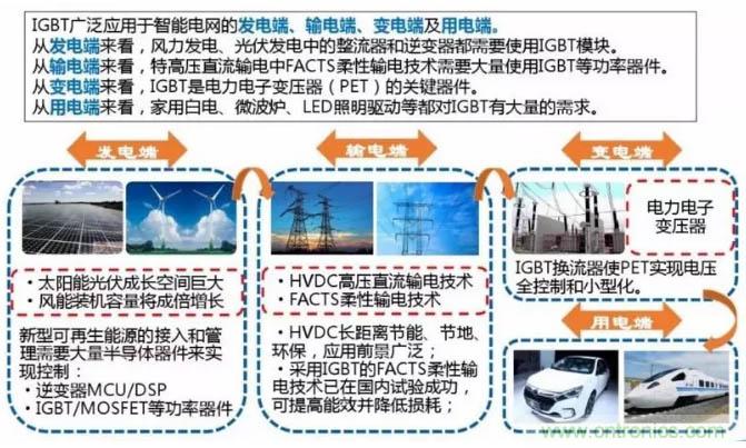 IGBT廣泛應(yīng)用于智能電網(wǎng)的發(fā)電端、輸電端、變電端及用電端: