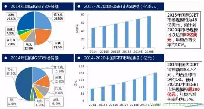 2015年國(guó)際IGBT市場(chǎng)規(guī)模約為48億美元,預(yù)計(jì)到2020年市場(chǎng)規(guī)模可以達(dá)到80億美元,年復(fù)合增長(zhǎng)率約10%。2014年國(guó)內(nèi)IGBT銷售額是88.7億元,約占全球市場(chǎng)的1∕3。預(yù)計(jì)2020年中國(guó)IGBT市場(chǎng)規(guī)模將超200億元,年復(fù)合增長(zhǎng)率約為15%。