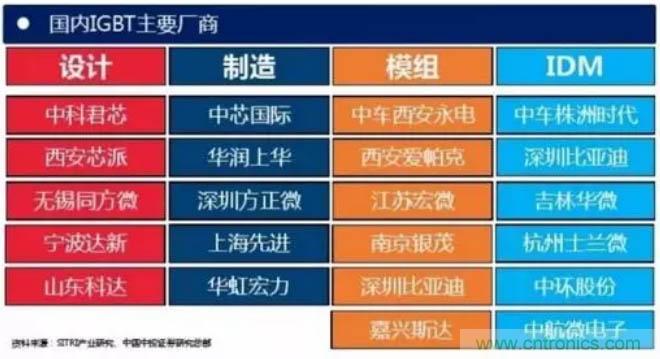 從公司來看,國(guó)外研發(fā)IGBT器件的公司主要有英飛凌、 ABB、三菱、西門康、東芝、富士等。中國(guó)功率半導(dǎo)體市場(chǎng)占世界市場(chǎng)的50%以上,但在中高端MOSFET及IGBT主流器件市場(chǎng)上,90%主要依賴進(jìn)口,基本被國(guó)外歐美、日本企業(yè)壟斷。