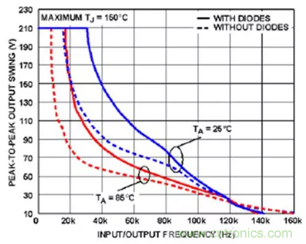 動態SOA也是要關注的方面。ADHV4702-1采用了內部壓擺率升壓電路來實現19兆赫 (MHz) 小信號帶寬和74伏/微秒 (µs) 的壓擺率,但這種升壓電路可能會消耗大電流,具體取決于信號。為此,使用ADHV4702-1加裝外部二極管可限制差分輸入電壓(圖9)。