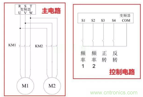 我們通過兩個接觸器實(shí)現(xiàn)變頻器對電機(jī)驅(qū)動的切換,在控制部分我們采取最簡單的使用外部端子來實(shí)現(xiàn)電機(jī)的啟動、停止以及速度的調(diào)節(jié)。那對于雙速電機(jī),我們采用多段速調(diào)頻每個端子S1、S2就代表一個速度,這個速度的大小我們能在變頻器參數(shù)中進(jìn)行自定義設(shè)定比如20Hz,50Hz等。那對于正反轉(zhuǎn)控制電機(jī)就更簡單了,我們只需要控制S3和S4端子的閉合就能實(shí)現(xiàn)。以上只是簡單的舉例說明,在我們實(shí)際應(yīng)用當(dāng)中還要考慮變頻器與電機(jī)容量的關(guān)系,不能過載運(yùn)行,如果兩個電機(jī)參數(shù)不一樣,我們還必須對變頻器進(jìn)行詳細(xì)參數(shù)調(diào)節(jié),可以把兩臺電機(jī)的控制參數(shù)都輸入到變頻器中,到時候用到哪臺就調(diào)取其參數(shù)。比如頻率設(shè)定源組合、命令源、加減速時間、可以通過端子進(jìn)行切換。