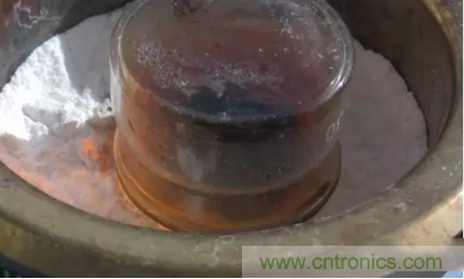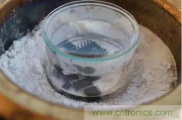 首先把要拆解的芯片放置在裝了濃硫酸的容器里,容器需要蓋住,但不能嚴(yán)實(shí),這樣里面的氣體才能漫溢出來。把容器里的濃硫酸加熱到沸騰(大約 300 攝氏度),在瓶底的周圍鋪上蘇打粉——用來預(yù)防意外飛濺出來的硫酸液和冒出來的硫酸氣體。