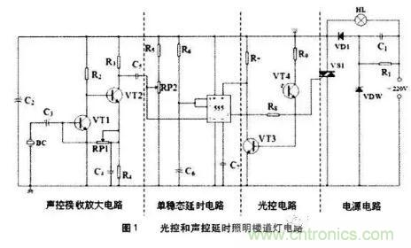 在圖1中,聲控接收放大電路是以三極管VT1、VT2為核心的單元電路,光控電路是以VT3為核心的單元電路。