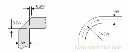 RF信號線如果走直角,拐角處的有效線寬會增大,阻抗不連續(xù),引起信號反射。為了減小不連續(xù)性,要對拐角進行處理,有兩種方法:切角和圓角。圓弧角的半徑應足夠大,一般來說,要保證:R>3W。如圖右所示。