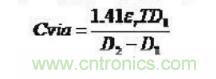 從等效電路模型可知,過孔本身存在對地的寄生電容,假設過孔反焊盤直徑為D2,過孔焊盤的直徑為D1,PCB板的厚度為T,板基材介電常數(shù)為ε,則過孔的寄生電容大小近似于: