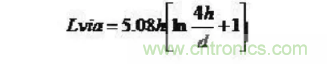 它的寄生串聯(lián)電感會削弱旁路電容的貢獻,從而減弱整個電源系統(tǒng)的濾波效用。假設L為過孔的電感,h為過孔的長度,d為中心鉆孔的直徑。過孔近似的寄生電感大小近似于: