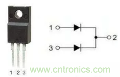 采用TO–220或TO–3P封裝的大功率快恢復二極管,有單管和雙管之分。雙管的管腳引出方式又分為共陽和共陰。