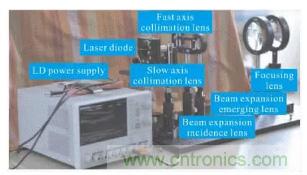 實(shí)驗(yàn)根據(jù)仿真優(yōu)化的光學(xué)元件間距,搭建光路平臺(tái)進(jìn)行實(shí)物驗(yàn)證,如圖9所示,從左至右依次為L(zhǎng)D驅(qū)動(dòng)電源(通過(guò)調(diào)節(jié)驅(qū)動(dòng)電壓可連續(xù)調(diào)節(jié)激光二極管輸出功率)、LD、慢軸準(zhǔn)直柱面透鏡、快軸準(zhǔn)直柱面透鏡、擴(kuò)束單元入射透鏡、擴(kuò)束單元出射透鏡及聚焦透鏡。