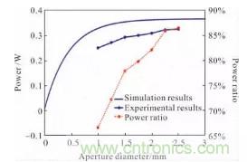 實(shí)驗(yàn)時(shí),對(duì)LD加載4.0V的偏置電壓,使用激光功率計(jì)測(cè)量LD的輸出功率為376mW。為獲得光束整形后的功率密度,以光斑中心為圓心,測(cè)量不同直徑圓內(nèi)多個(gè)點(diǎn)的激光功率并取平均值,通過(guò)差分計(jì)算出相鄰?fù)膱A所形成的圓環(huán)內(nèi)激光功率及圓環(huán)面積,二者求比值,得到不同圓環(huán)內(nèi)的平均激光功率密度。文中測(cè)量的光斑直徑為1.00、1.25、1.50、1.75、2.00、2.25、2.50mm。圖12橙線為平均激光功率密度離散值所繪制的折線圖,其趨勢(shì)表明光斑半徑越大,激光功率密度越小。藍(lán)線為擬合離散數(shù)據(jù),為高斯曲線,近似代表聚焦透鏡焦點(diǎn)處光斑功率密度的整體分布。圖13是不同光斑直徑下激光功率仿真結(jié)果(藍(lán)色曲線)與實(shí)驗(yàn)結(jié)果(藍(lán)色折線)的對(duì)比,實(shí)驗(yàn)結(jié)果與仿真結(jié)果基本吻合。紅色折線為不同直徑光斑內(nèi)激光功率同二極管輸出總功率之比。由圖13可知,1mm直徑圓內(nèi)激光功率為252mW,約占LD出射光束總功率的67%。說(shuō)明光束整形系統(tǒng)在實(shí)現(xiàn)提高激光功率密度的同時(shí)具備較高的功率傳輸效率。