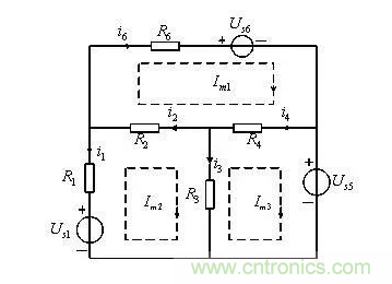 2) 若有m條支路,根據基爾霍夫電壓定律列(m-n+1)個的獨立回路電壓方程。為了計算方便,通常選網孔作為回路(網孔就是平面電路內不再存在其他支路的回路)。對于平面電路,獨立的基爾霍夫電壓方程數等于網孔數。