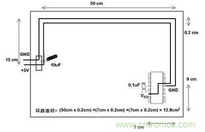 電源線和地線配合不當(dāng)?shù)腜CB設(shè)計示例如圖2所示,此電路板上,設(shè)計出的環(huán)路面積為697cm²。采用圖3所示的方法,電路板上或電路板外的輻射噪聲在環(huán)路中感應(yīng)電壓的可能性可大為降低。