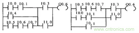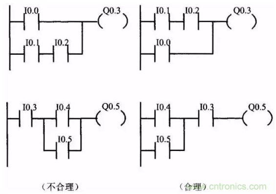 (3)幾個串聯(lián)支路相并聯(lián),應(yīng)將觸點(diǎn)多的支路安排在上面;幾個并聯(lián)回路的串聯(lián),應(yīng)將并聯(lián)支路數(shù)多的安排在左面。按此規(guī)則編制的梯形圖可減少用戶程序步數(shù),縮短程序掃描時間。
