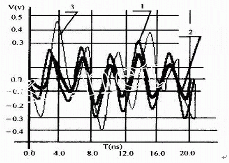 對于圖1所示的兩線系統(tǒng),我們進(jìn)行了三種情況的仿真(線網(wǎng)AB上的信號頻率均為100MHz)仿真結(jié)果見表3,及圖6.:第一種情況是在兩線間距和平行長度不變的條件下,探測被干擾對象的串?dāng)_(標(biāo)記“1”);第二種情況是在兩線平行長度不變的前提下,將兩線間距增加到10mils,然后探測被干擾對象的串?dāng)_標(biāo)記“2”;第三種情況是在兩線間距不變的條件下,將兩線的平行長度增加到2.6inches標(biāo)記“3”,然后探測被干擾對象的串?dāng)_。由仿真結(jié)果可見,當(dāng)兩線的間距拉大時(P由5mils變?yōu)?0mils),串?dāng)_明顯地減小了,而當(dāng)兩線的平行長度加長時(L由1.3inches變?yōu)?.6inches),串?dāng)_顯著增大了。
