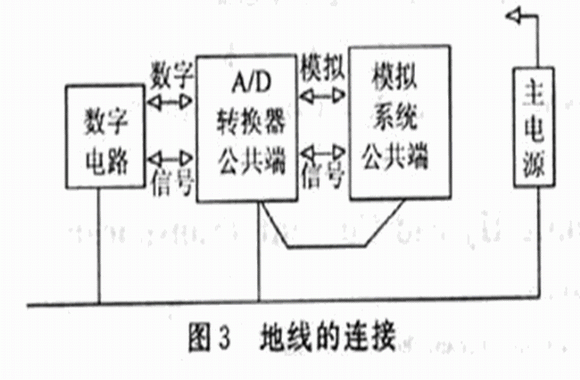 數(shù)字地線通常有很大的噪聲,而且有大的電流尖峰,所有的模擬公共地線應該和數(shù)字公共地線分開走線,然后只在一點匯集在一處,如圖3所示,這種接法使模擬和數(shù)字地線間的公共阻抗最小。