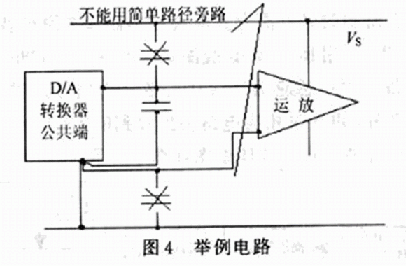 圖4說明這樣一種方法,他應用于模擬量輸出運算放大器對于數(shù)/模轉(zhuǎn)換器數(shù)字驅(qū)動噪聲的去耦,如果旁路電容隨意地直接接到電源的兩根母線之間,旁路電容起不到應有的作用,甚至可能有害,他從"不干凈"的到"清潔"的Vs,為噪聲提供低阻抗的交流通路。