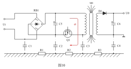 值得一提的是,開關(guān)電源變壓器初級線圈的漏感產(chǎn)生的反電動(dòng)勢et,在所有干擾信號之中是最不容忽視的,如圖10所示。當(dāng)電源開關(guān)管關(guān)斷的時(shí)候,開關(guān)電源變壓器初級線圈的漏感產(chǎn)生的反電動(dòng)勢et幾乎沒有回路可釋放,一方面,它只能通過初級線圈的分布電容進(jìn)行充電,并讓初級線圈的分布電容與漏感產(chǎn)生并聯(lián)諧振;另一方面,它只能通過輻射向外進(jìn)行釋放,其中通過對地電容C3與大地相連,也是反電動(dòng)勢et釋放能量的一個(gè)回路,因此,它對輸入端也會(huì)產(chǎn)生共模信號干擾。