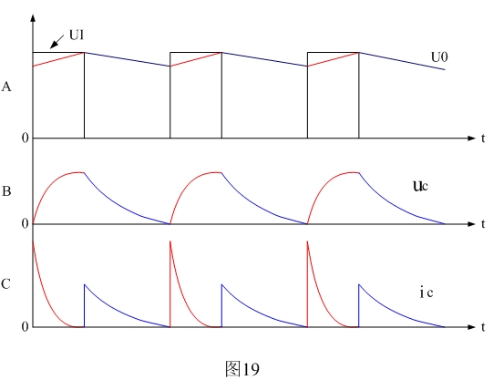 圖19是開關電源整流輸出電壓以及電源濾波電容的紋波電壓和紋波電流波形。圖19中紅線表示電容器充電時的電壓、電流變化曲線,藍線表示電容器放電時的電壓、電流變化曲線。其中Ui表示整流輸出電壓,Uo表示經過濾波后的輸出電壓,uc表示濾波電容的紋波電壓,ic表示濾波電容的紋波電流。