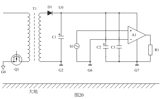 下面我們以圖18為例來分析地線對EMC產生的影響。圖18中Q1表示開關電源,T1為開關變壓器,D1為整流二極管,C1、C2、C3為濾波電容器,A1為功率放大器,S1為功率放大器輸入信號,R1為功率放大器輸出負載,G1、G2、G3、G4、G5、G6、G7、G8為各個器件的地;Ui表示整流輸出電壓,Uo表示經過濾波后的輸出電壓。