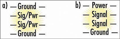 [page]第一種為首選方案,PCB的外層均為地層,中間兩層均為信號/電源層。信號層上的電源用寬線走線,這可使電源電流的路徑阻抗低,且信號微帶路徑的阻抗也低。從EMI控制的角度看,這是現有的最佳4層PCB結構。