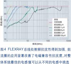 物理層應(yīng)用指南明確指出了對FlexRay網(wǎng)絡(luò)數(shù)據(jù)線扼流圈的總體要求,比如引線電阻(<1W)、電感(>50mH)以及雜散電感(<1mH)。對電磁輻射和電磁干擾的測定與CAN總線一樣。不過,由于10Mbit/s的更高傳輸率,需要更加仔細地檢查信號完整性。圖4所示為對具有各種電感的扼流圈與不使用扼流圈的測試板進行DPI測定的相應(yīng)評估結(jié)果。圖五所示為使用另一塊測試板進行電磁干擾測量的結(jié)果,同樣是針對具有不同電感的扼流圈。很明顯可以發(fā)現(xiàn),數(shù)據(jù)線扼流圈的使用改善了電磁兼容性并減少了干擾輻射。當(dāng)電感更高時,作用就更大。不過,更高的電感值會對信號完整性產(chǎn)生一定的負面影響。[page]