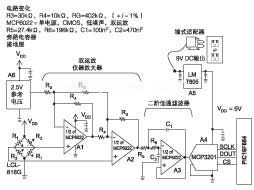 這個電路的模擬部分有一個稱重傳感器、構成一個儀器放大器的雙運放(MCP6022)、一個12位100kHzSARADC(MCP3201)和一個參考電壓。ADC的SPI端口直接連接到一個微控制器(見圖2)。
