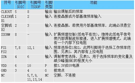 在擴展頻譜時鐘發生中,EMI減弱要依靠整形、調制率和調制波形的頻率。當整形及調制波形的頻率由已定的頻率來確定時,調制的百分比就會有所不同。使用頻率選擇位(FS1及FS2)能設置頻率范圍。擴展率也被設到-1.25%之間。見表2。高擴展率加強了對EMI的減弱,然而,高擴展率卻可能會因為超過系統最大額定頻率或低于平均頻率而使性能受到影響。鑒于上述原因,擴展率多在0.5%--2.5%之間。