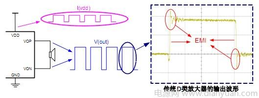 傳統(tǒng)D類放大器開關(guān)輸出的拓?fù)浣Y(jié)構(gòu)是一個(gè)很好的EMI發(fā)射源:如調(diào)制的開關(guān)信號(hào),開關(guān)信號(hào)的邊沿變化,電源線上變化的電流信號(hào)等都會(huì)產(chǎn)生大量的EMI,如下圖所示。
