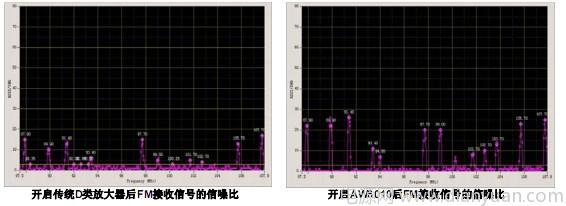 下圖是傳統(tǒng)D類放大器和帶EEE技術(shù)的AW8010對(duì)FM接收信號(hào)的信噪比影響。傳統(tǒng)D類放大器對(duì)FM的影響很嚴(yán)重,信號(hào)變差甚至丟臺(tái),而帶EEE技術(shù)的AW8010對(duì)FM影響很小,降低了系統(tǒng)工程師的調(diào)試難度。