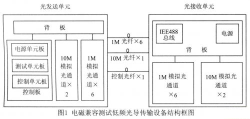 EMC測試低頻光導傳輸設備由光發送單元和光接收單元組成。光發送單元由背板、控制板(包括電源單元、測試信號發生器單元及控制電路單元)、1OMHz通道發送板(2通道)以及1MHz通道發送板(6通道)組成;光接收單元由背板(包括電源單元、IEEE488接口單元)、10MHz通道接收板(2通道)以及1MHz通道接收板(6通道)組成。如圖1所示。