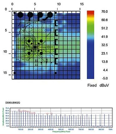 在任何新PCB的開發過程中,設計工程師都必須找出設計之外的輻射體或射頻泄漏,并對其進行描述和處理以通過一致性測試。可能的輻射體包括高速、大功率器件以及具有高密度或高復雜度的器件。掃描系統以疊加在Gerber文件上的形式顯示空間輻射特性,因此測試人員可以準確地找出所有輻射問題的來源。設計工程師可以在采取了相應的解決措施之后,對器件進行重新測試并立即量化出校正設計后的效果。
