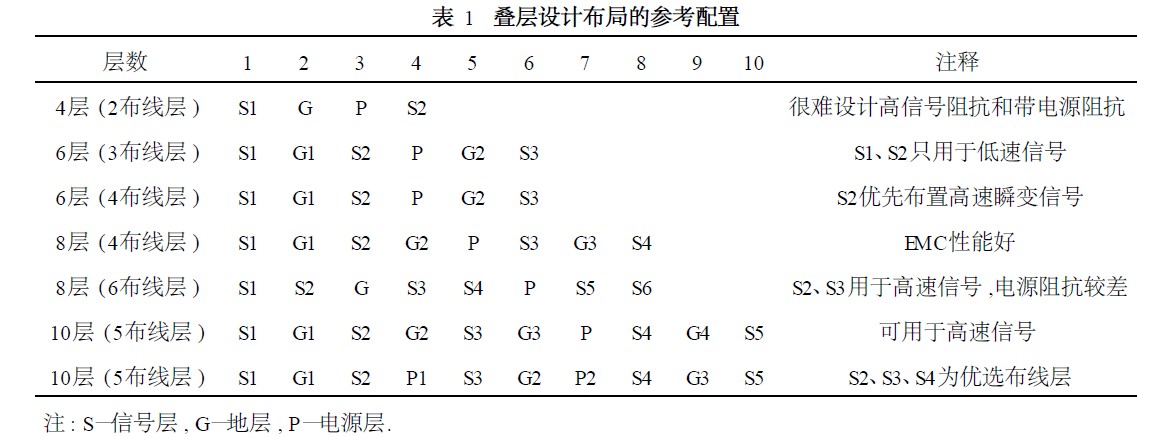 如果第2層分配為“地”,且第4層分配為處理器的電源,則過孔距離放置處理器和去耦電容器的頂層應(yīng)該盡可能短。延伸到板的底層的過空剩余部分不包含任何重要的電流,而且距離短不會具有天線作用。表1列出了疊層設(shè)計(jì)布局的參考配置。