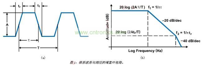 對(duì)于CCM中運(yùn)作的降壓轉(zhuǎn)換器,電感電流一直是非零的正電流。在這種情況下,負(fù)載周期為D=Vout/Vin,在本例中為38%(5V/14V)。使用200kHz的開關(guān)頻率時(shí),我們很快計(jì)算出導(dǎo)通時(shí)間為1.8μs。為支持此頻率,控制開關(guān)的上升/下降時(shí)間必須小于90納秒。這使得我們注意到第一個(gè)減少噪聲的方法,也就是斜率控制。您可能還無法理解,但是此時(shí)我們非常了解與PWM切換節(jié)點(diǎn)有關(guān)的諧波,也就是開關(guān)穩(wěn)壓器的控制波形。如果將此波形以圖1(a)中所示的梯形表示,波形的諧波便能夠以圖1(b)中的內(nèi)容表示,這表明了EMI背后的驅(qū)動(dòng)因素。這一傅里葉包絡(luò)定義了可通過傅里葉分析或計(jì)算梯形波形導(dǎo)通時(shí)間及上升時(shí)間取得的諧波振幅。