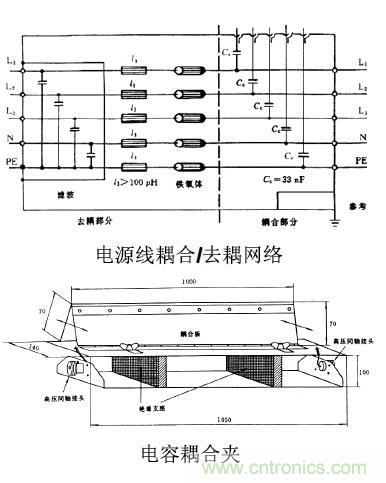 作為佐證,我們利用電源線耦合/去耦網絡來加以說明:在圖中可以看到從試驗發生器來的信號電纜芯線通過可供選擇的耦合電容加到相應的電源線(L1、L2、L3、N及PE)上,信號電纜的屏蔽層則和耦合/去耦網絡的機殼相連,機殼則接到參考接地端子上。這就表明脈沖群干擾實際上是加在電源線與參考地之間,因此加在電源線上的干擾是共模干擾。