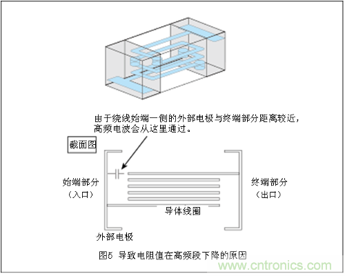 通過前記圖3中介紹的片狀鐵氧體磁珠阻抗頻率特性可以看出,阻抗值以 400-500MHz范圍為界開始減少。這是由于片狀磁珠的結構所帶來的影響。一般來說,電感器的阻抗會隨著頻率的上升而逐步增大。然而,如圖5所示,普 通的片狀鐵氧體磁珠內部在繞線始端(入口)和終端(出口)附近會存在相互較為接近的部位。由于這個部分會發生靜電耦合(存在一個微型電容的狀態),高頻電 流通過這里時會出現不容易受電感器阻抗影響的情況。由于頻率越高,靜電耦合部分越容易通過,因此頻率越高所顯示的阻抗也就越低。