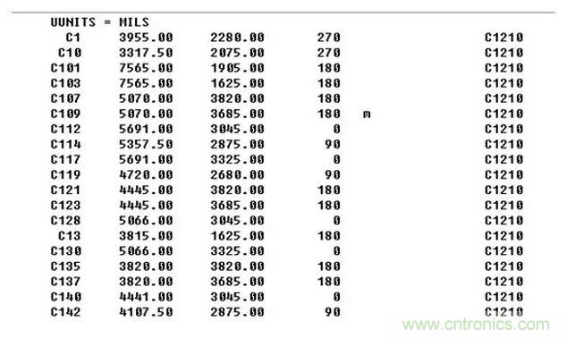 大家可以清晰可以的看到第一行表示的是單位mil。第一列是器件位號,第二列是X軸坐標,第三列是Y軸坐標,第四列是旋轉度數,第五列是表示器件放在top面(空白)或者bottom面(m-Mirror的縮寫),第六列是器件封裝名。對于一個器件的定位信息來說,直接 感覺一下,似乎我們只需知道是哪個器件也就是器件位號,放置在哪一面,也就是在表面還是底面,旋轉度數以及具體的xy坐標,信息就全了。對于是哪種封裝類型似乎不是必需的,那么說到這,我想大家也就明白在遇到上述情況時,可以進行一些更為簡單的操作了。