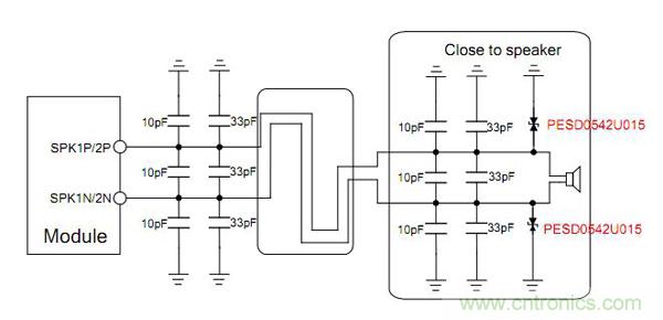 對于揚聲器的靜電保護,可以采用0402或0201的超低電容 ESD器件PESD0542U015,可以節約布板空間,且因為0.05PF的電容,可以保證此模擬信號的完整傳輸。