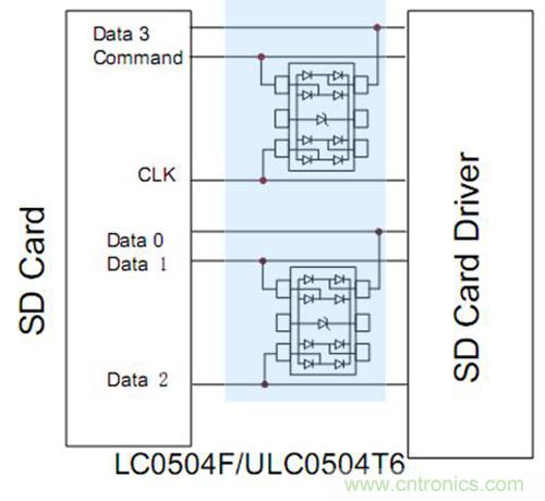 SD卡重點保護data數據線和CLK,要確保選擇的ESD器件是低容值和小封裝的產品:LC0504F SOT-563