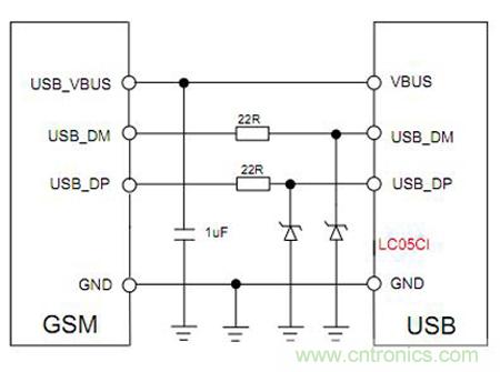 此模塊USB經常用來配置數據,插拔容易被靜電損壞,本方案可以采用分立器件或者集成器件,但要確保選擇的器件結電容小于3PF。