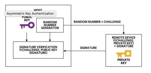基于非對稱加密的安全認證依賴于兩個密鑰:私鑰和公鑰。只有被認證的設備知道私鑰,而公鑰可透露給希望對設備進行安全認證的任何一方。與上文中討論的方法一樣,主機向設備發送質詢。設備根據質詢和私鑰計算數字簽名,并將其發送給主機(圖2)。但此時,主機使用公鑰對數字簽名進行驗證。用于計算數字簽名的函數擁有特定數學屬性至關重要。非對稱方法中最常用的函數是RSA和ECDSA。同樣,設備也在不泄露密鑰情況下提交了自己知道密鑰的證明,即私鑰。