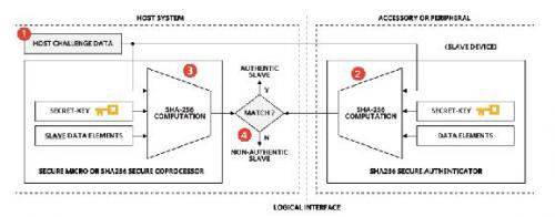 Maxim的DS28E15/22/25 IC基于SHA-256技術,擁有不同的內部存儲器容量。由于主機和設備側儲存有相同的密鑰,我們建議主機側使用協處理器,例如DS2465。